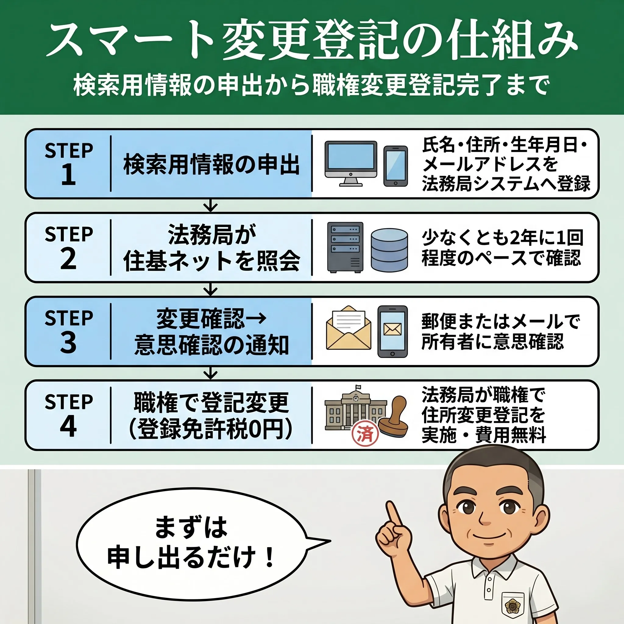 スマート変更登記(検索用情報の申出から職権登記完了まで)の仕組みを4ステップで解説するフロー図