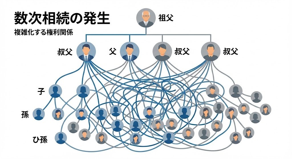手続きをしないまま相続人の誰かが亡くなると、その権利はさらにその子供たちへ引き継がれます。これを繰り返すと、当初は数人で話し合えば済んだものが、数十年後には関係者が数十人に膨れ上がり、面識のない親戚同士で遺産分割協議を行わなければならなくなります。