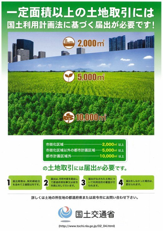 国土交通省・土地・水資源局土地利用調整課では、10月を土地月間と定めて各種の広報活動を行っています。 ようは、ある一定以上の面積の土地の取引(売買など)をしたときは、都道府県知事又は政令市長に届出しなさいってことです。 土地の投機的な取引...